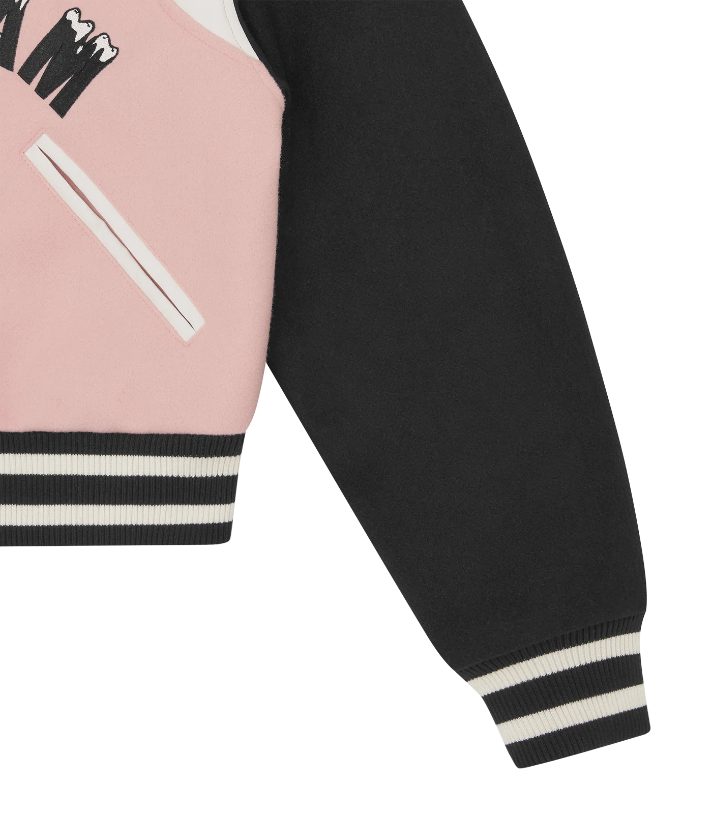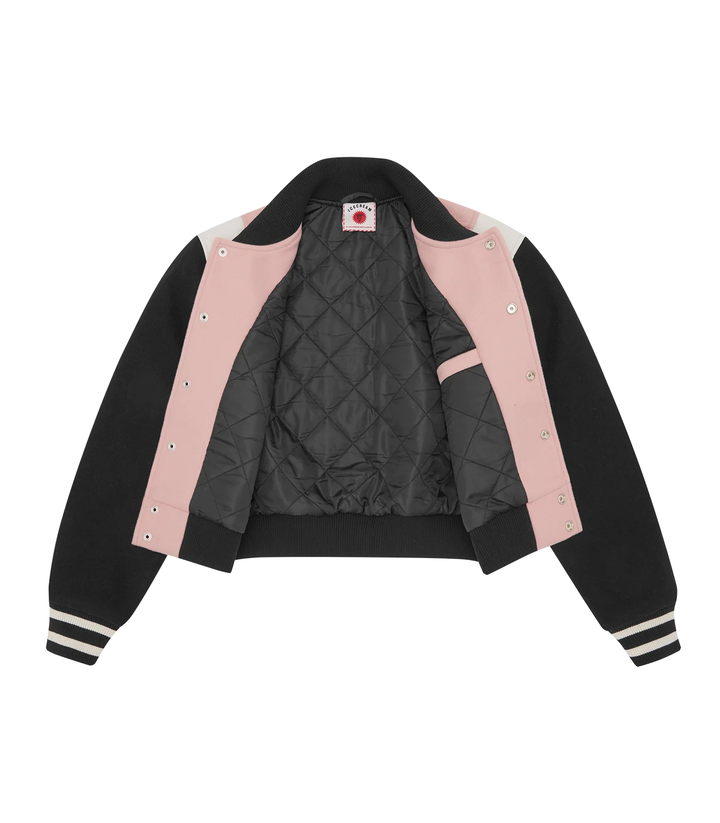 DRIPPY CROPPED VARSITY JACKET - PINK Open image lightbox